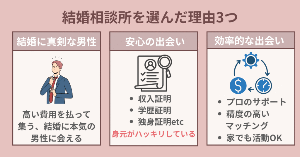 簡単に言うと、結婚に本気の男性しかいない、男性の身元がハッキリしている、コスパタイパの良さということです。