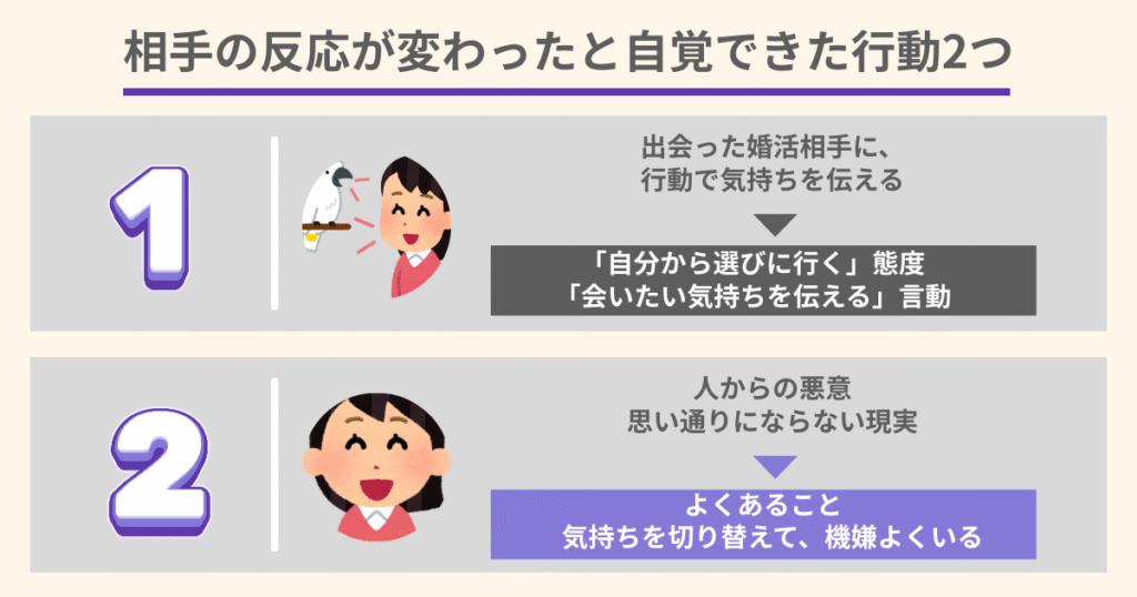 しかし、婚活で自分を見直していく中で、相手の反応が変わったなと思い良い結果につながったと自覚できた行動が2つあります。