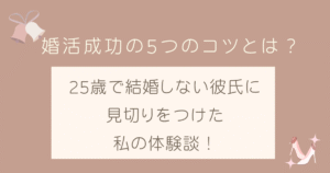 25歳の時に結婚願望のない彼氏とお別れ。合コン、街コン、婚活パーティー、友達の紹介などで出会いを探す。