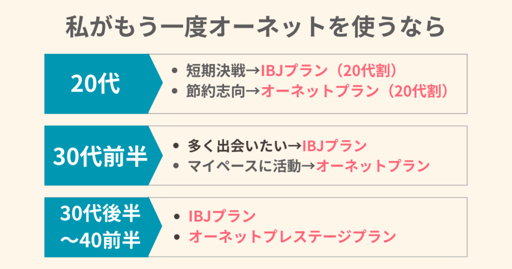 1年以内に必ず成婚する決意があるならIBJプラン(20代割)、とにかく費用を抑えたい場合はオーネットプラン(20代割)にします。