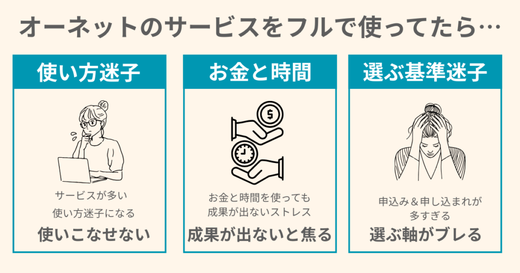 忙しい女性オーネットに興味はあるけど、 サービスが多すぎて、どう使えばいいのか分からない。