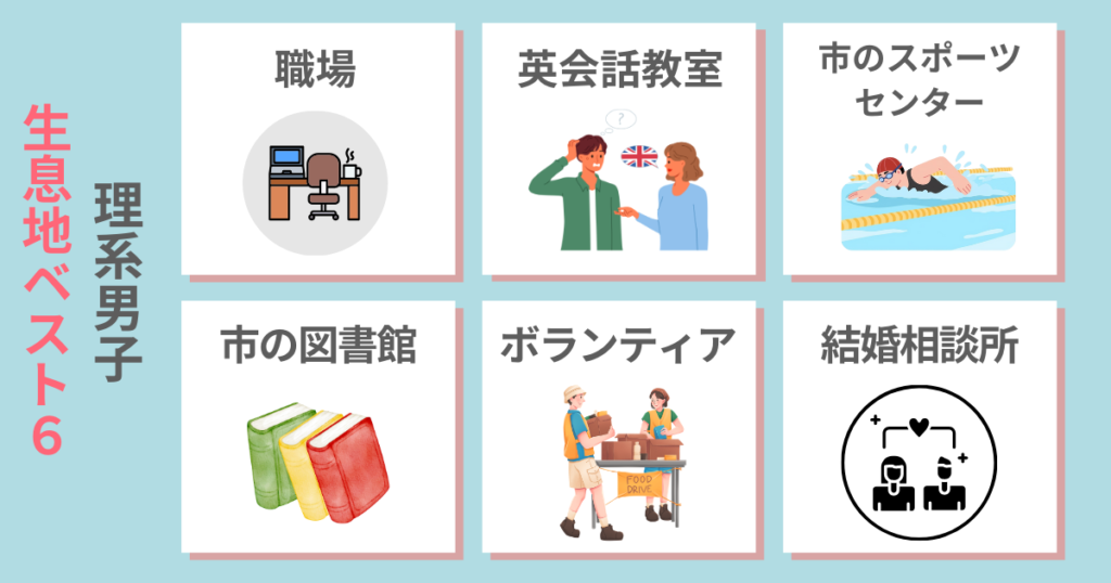 技術系の職場、英会話教室、市のスポーツセンター、市の図書館、ボランティア、結婚相談所の6つが代表的です。年齢や婚活フェーズによって最適な場所は変わります。記事内「理系男子はどこにいる?生息地ベスト6」「理系男子はどこにいる?年代別おすすめフィールド(20代/30代/40代)」参照。